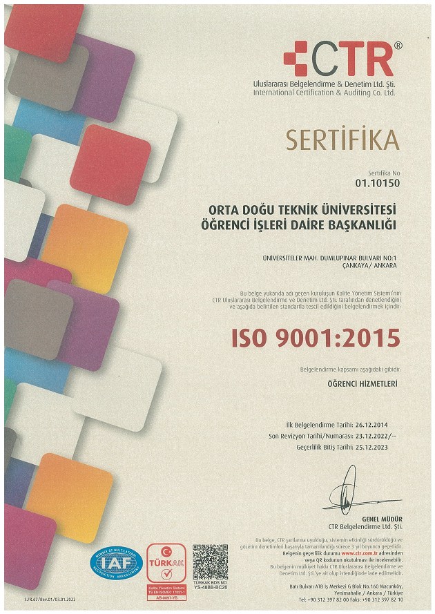 ODTÜ Öğrenci İşleri Daire Başkanlığı, 27 Aralık 2013 tarihinde ISO 9001: 2008, 20 Aralık 2017 tarihinde de ISO 9001:2015 Kalite Yönetim Sistemi Belgelerini almaya hak kazanmıştır.